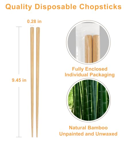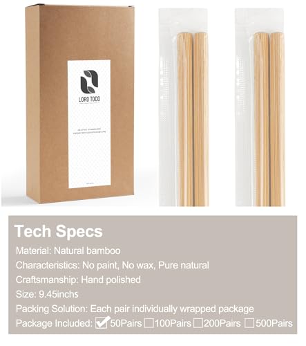 LOROTOCO - 50 Pairs Chopsticks Disposable Reusable 9.5" Individually Wrapped Bulk Premium Quality