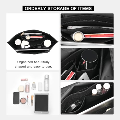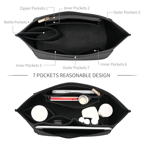 - HIGH CAPACITY-MULTI-COMPARTMENTS: Featuring 7 compartments,Two of the pockets, which are exterior pockets, are for storing large items,Five pockets remain, one cup pocket opening and one zippered pocket(Made with high quality metal zipper head for long lasting use)You could store your mobile phone, wallet, cosmetics, glasses and other personal items in purse organizer insert, which is easy to switch bags throughout the day without having to reorganize.