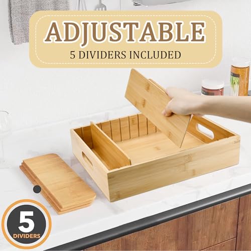 - 6 compartment dividers and removable design: the wooden pan storage is equipped with 5 removable dividers. You can freely remove the dividers according to the size and shape of the items to adjust the separation space. It can effectively use any storage compartment to ensure items are neatly classified.