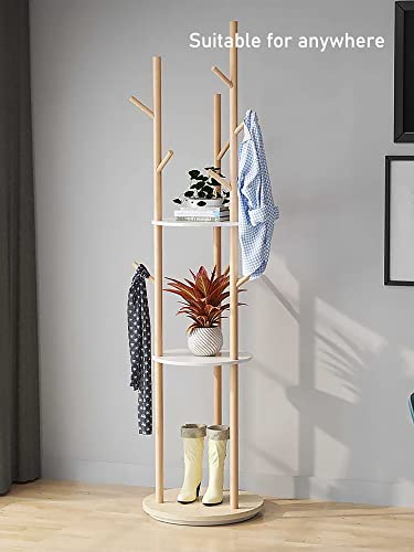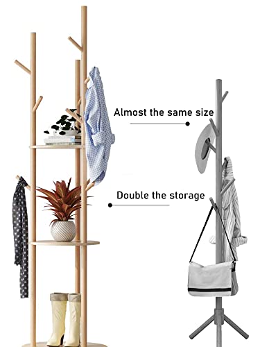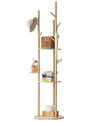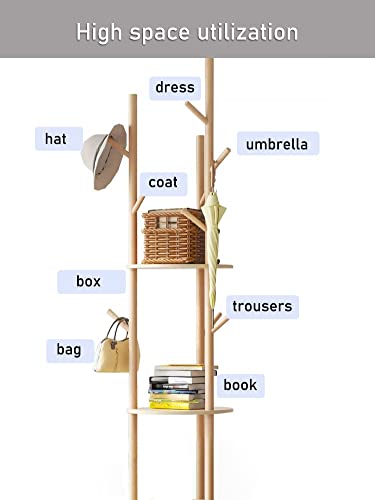 - [Space Saving] 9 hooks to store clothes, keys, hats, handbags or scarves. 3 tiers of shelves provide extra storage where you can display books, plants, bags and more. Solid lacquered pinewood screw-on pieces make our coat rack freestanding strong enough to support multiple heavy items; it won't wobble or tip over even when fully loaded.
