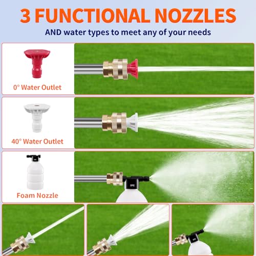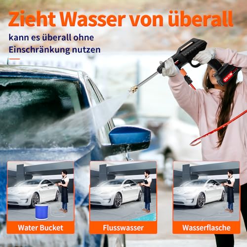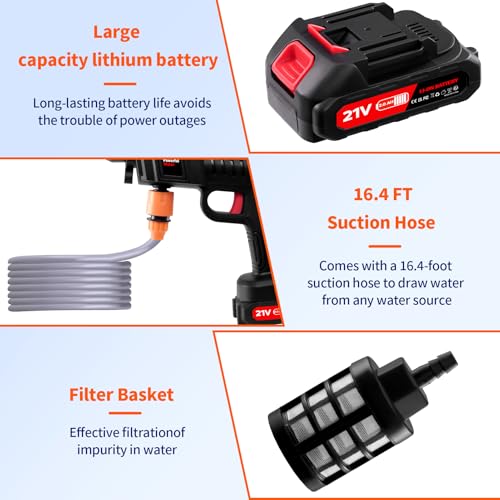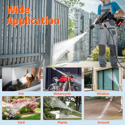 - 【Convenient Outdoor Use】This cordless pressure washer battery car washer allows you to wash your car anywhere outdoors. Just place the water pipe into any water source like a rivulet or bucket, and you can start washing your car immediately, enabling you to clean your vehicle at any time and place.