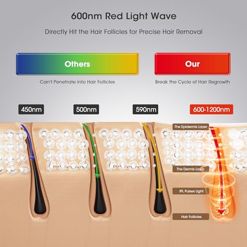 - 【600NM-1200NM Wavelength】Unlike other IPL devices with short wavelengths such as 450/500/560nm, LUBEX painless hair removal device features a wavelength of 600nm to 1200nm, which could be preferentially absorbed by melanin, converting light energy into heat to destroy the follicle. Get rid of unwanted hair more safely and effectively.