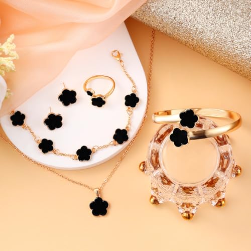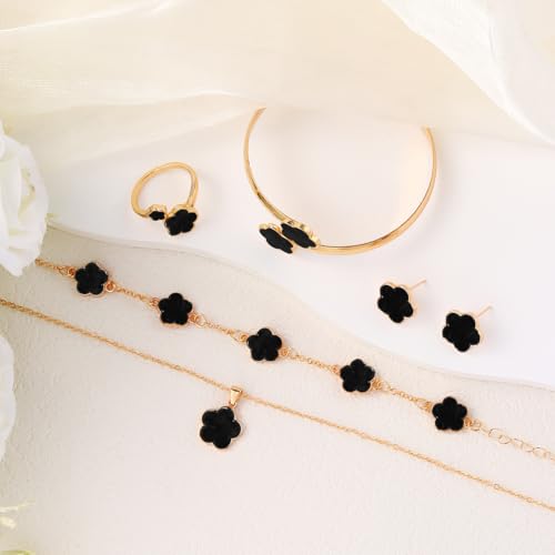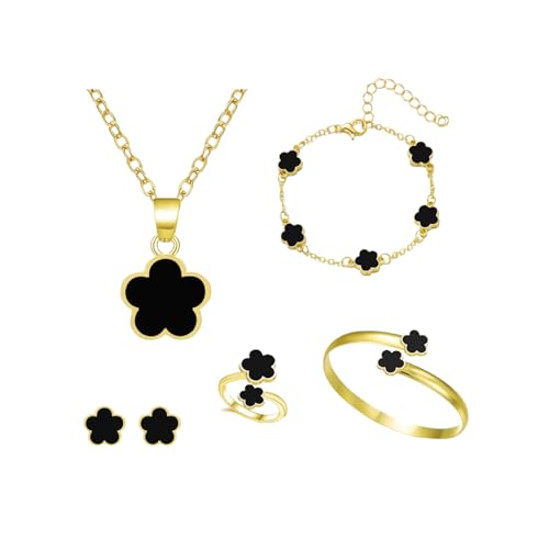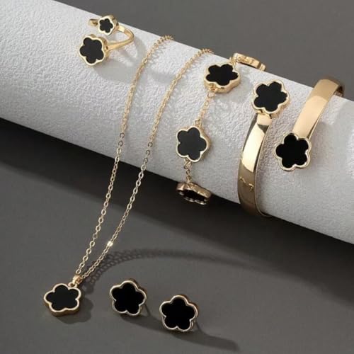 FRIDAYIN - طقم مجوهرات زهرة الحظ ورقة البرسيم رباعية الأوراق مكون من 5 قطع سوار وانسيال وسلسلة وخاتم وحلق لهدايا عيد الميلاد وعيد الحب