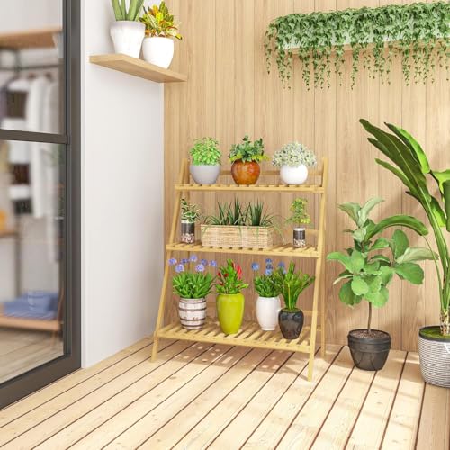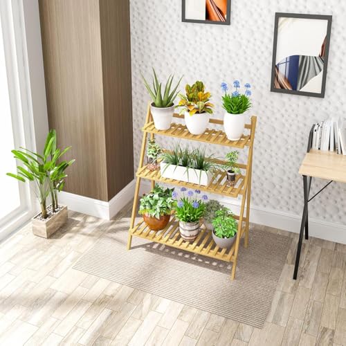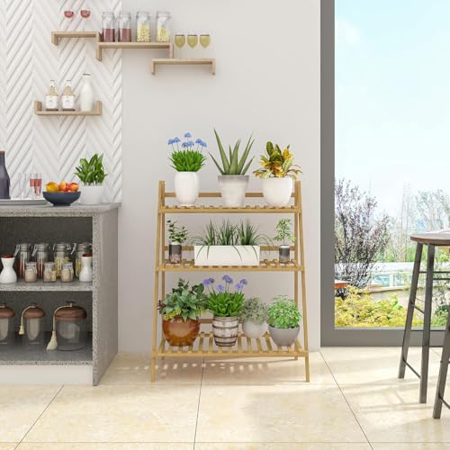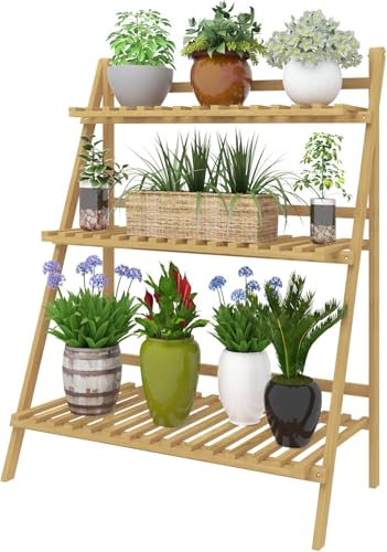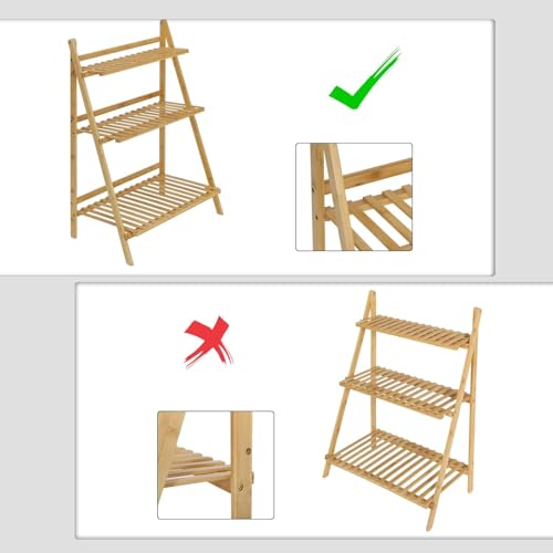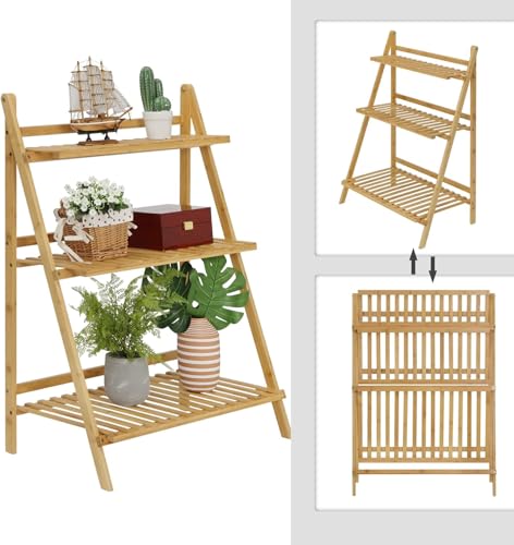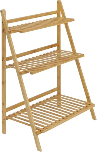 Lukzer - لوكزر حامل نباتات من الخيزران من 3 طبقات للاستخدام الداخلي والخارجي | رف وعاء زهور خشبي سلم للشرفة والحديقة وغرفة المعيشة | رف متعدد الاغراض بلمسة نهائية طبيعية للنباتات المحفوظة بوعاء والتخزين وديكور