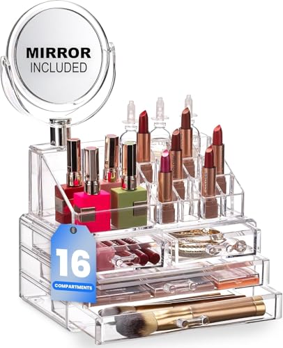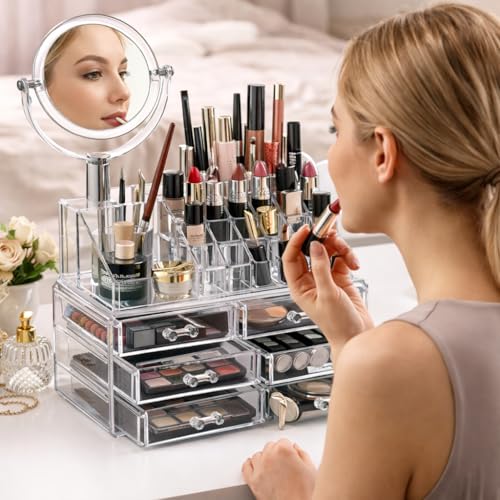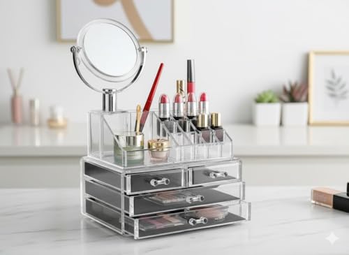 Generic - LuxeGlow 360° Acrylic Makeup Organizer with Rotating Mirror – 3 Drawers & Multi-Slot Top Tray – Clear Vanity Storage for Lipsticks, Brushes, Skincare & Jewelry - Elegant Space-Saving Beauty Station.