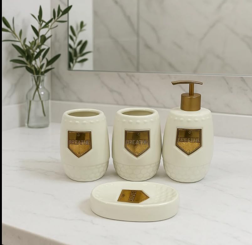 - طقم إكسسوارات حمام فاخر من السيراميك - 4 قطع بلون عاجي مع لمسات ذهبية أنيقة