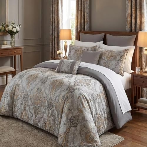Generic - طقم لحاف مقاس كينج مصنوع من خليط قطن بنقش دمشقي بيج ونمط هندسي أسود مع 2 كيس خدادية