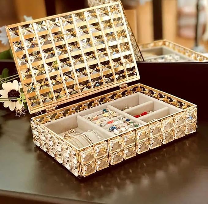 - اجعلي من لحظاتك اليومية تجربة راقية، وامنحي مجوهراتك ومستحضراتك منزلًا يليق بها. مع هذا الصندوق الكريستالي الفاخر، سيكون التنظيم متعة لا مهمة!