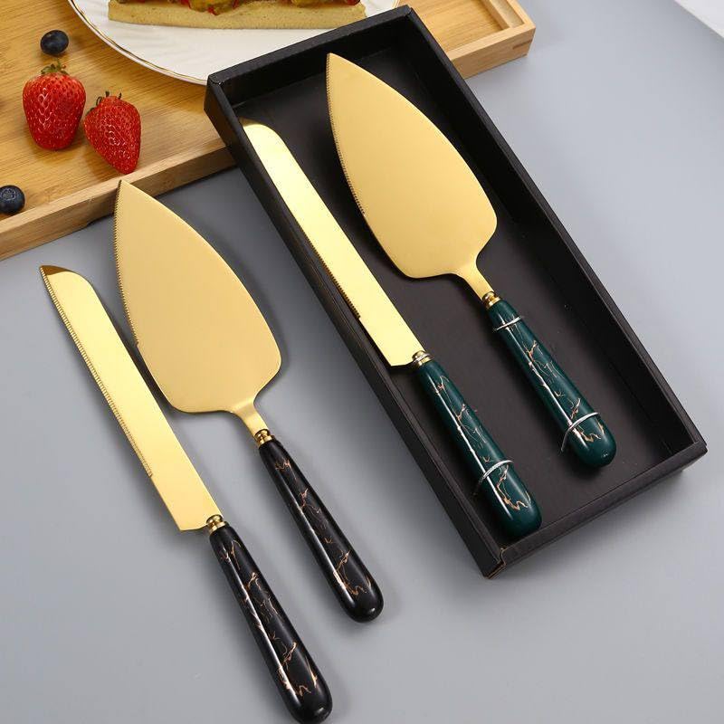 Generic - Luxury Gold Cake Knife Set, Set of 3 with Marbled Handles, Dessert and Cheese Server, Black and Gold