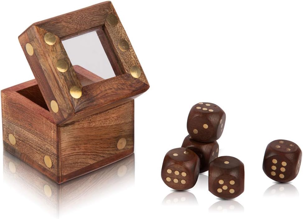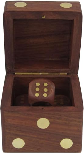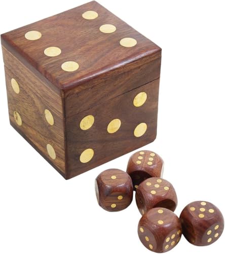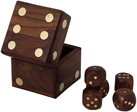 AREXOL - صندوق نرد خشبي هندي فاخر مصنوع يدويًا 6 سم مع 5 نرد مزخرف من النحاس الاصفر، مجموعة العاب تقليدية فاخرة للمنزل والمكتب