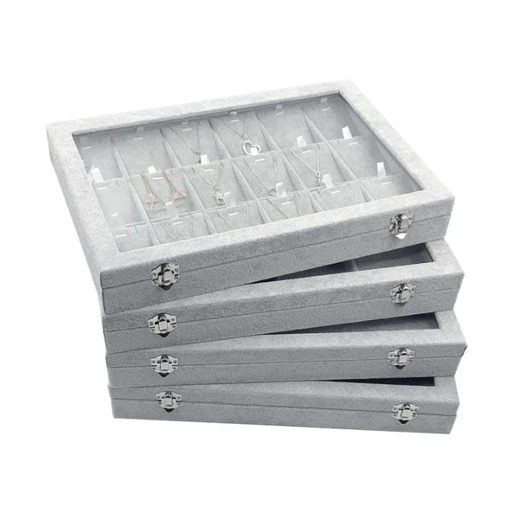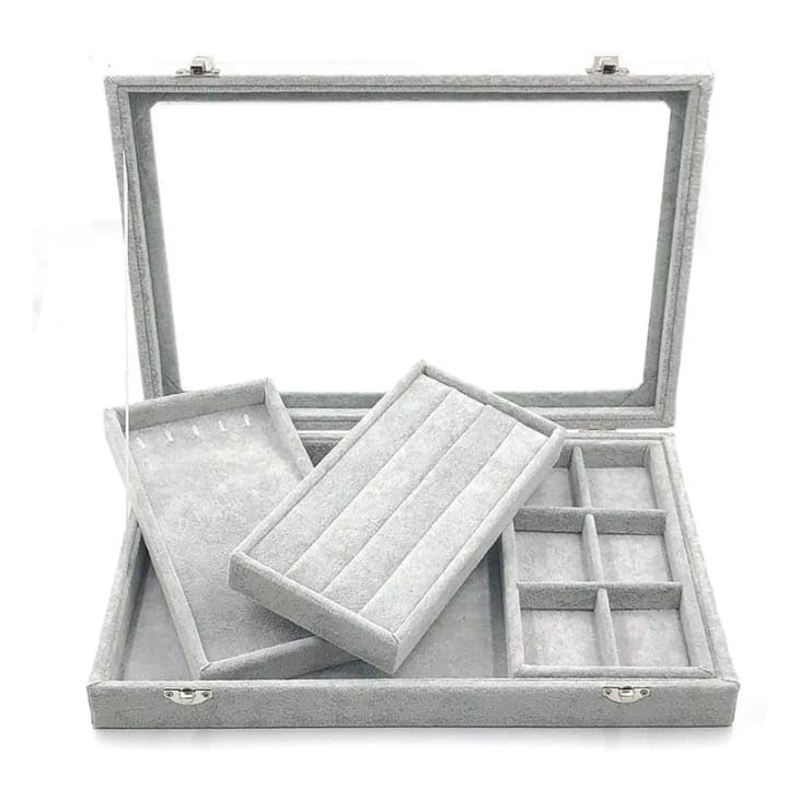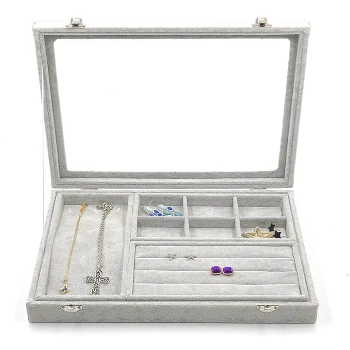 Generic - صندوق مجوهرات فاخر مع غطاء زجاجي، منظم للخواتم والإكسسوارات متعدد الأقسام، رمادي، ٣٢ سم