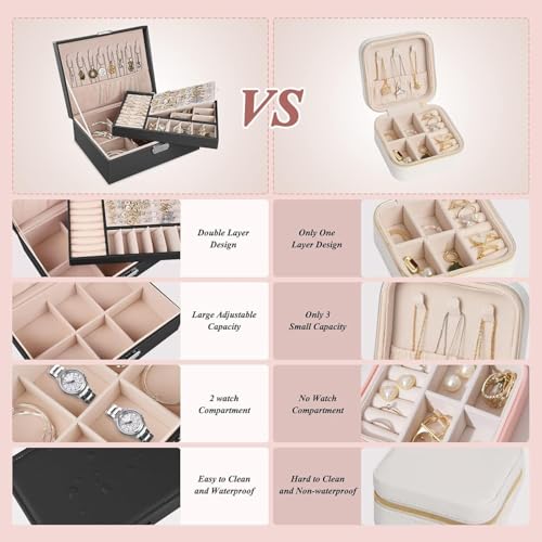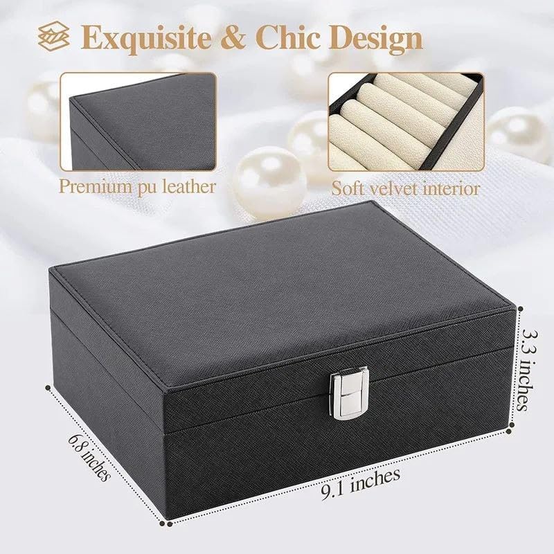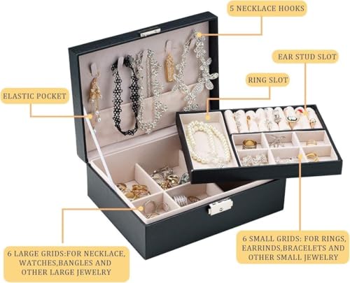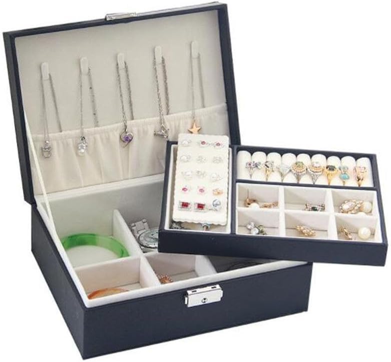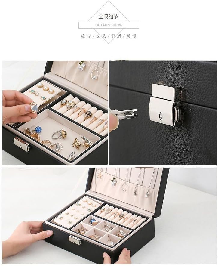 Generic - حافظة مجوهرات جلدية فاخرة - منظم من طبقتين مع قفل امن للاكسسوارات والخواتم والقلائد والاقراط (اسود، تصميم محمول)