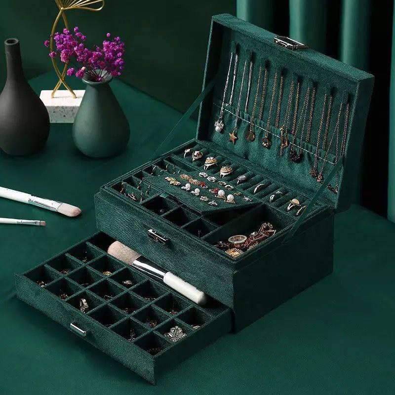 Generic - Luxury Multi-Layer Jewelry Accessories Box, Green Velvet Jewelry Accessories Organizer Velvet