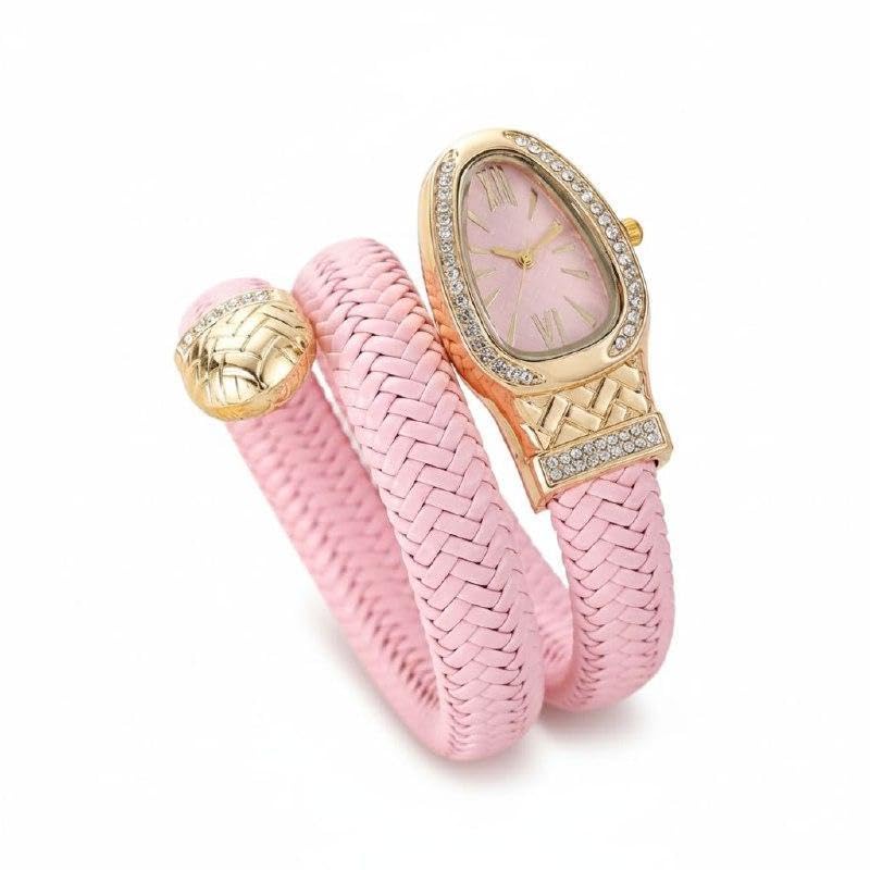 Generic - ساعة فاخرة بتصميم ثعبان - سوار جلدي مضفر، زخرفة كريستال ذهبية، حركة كوارتز، لمسات متعددة الالوان لنمط انثوي راقي