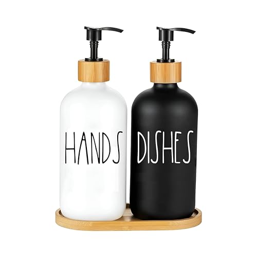 - Elevate your kitchen decor with this elegant soap dispenser set, featuring a sturdy glass structure and luxurious pumps. The set includes two glass bottles and a stylish bamboo tray, making it a perfect addition to modern farmhouse or boho decor.