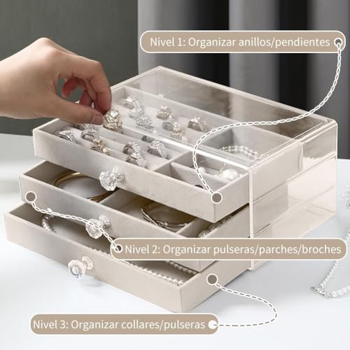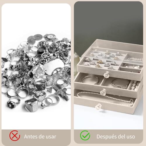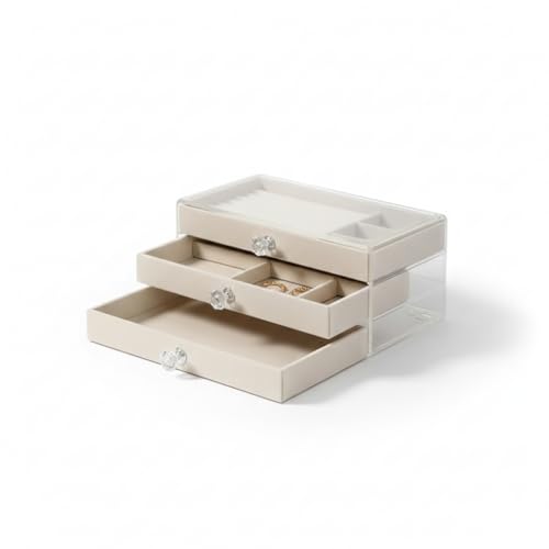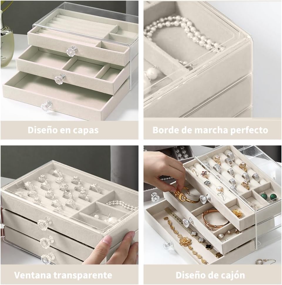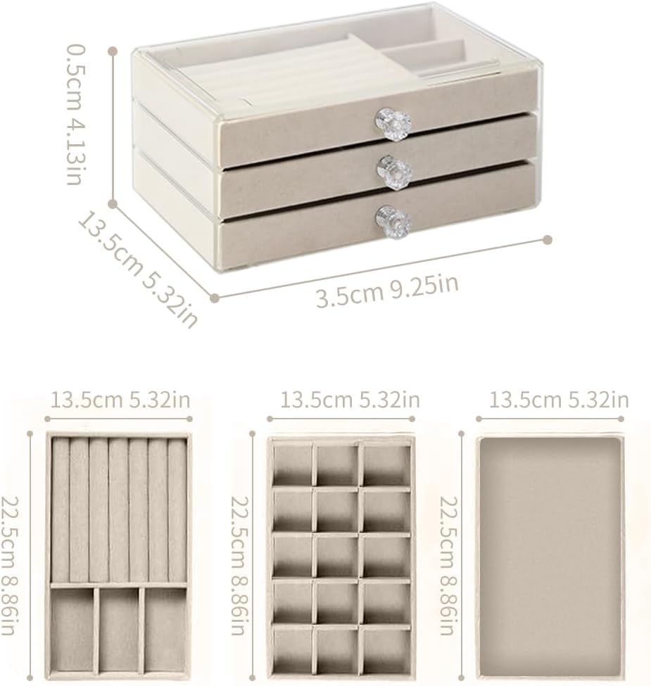 - منظم فاخر بثلاث طبقات (3 أدوار) يوفر سعة تخزين واسعة ومرتبة للإكسسوارات: يتميز هذا المنظم بتصميم ذكي متعدد المستويات، حيث يوفر كل دور مساحات مخصصة تضمن تنظيم الخواتم، السلاسل، والأقراط بشكل منفصل ومرتب، مما يسهل الوصول إليها.