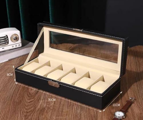 Generic - Luxury Watch Display Box, Black Leather with Glass Lid, 6 Watch Storage Case, Cream Velvet Liner, Precious Watch Organizer Box