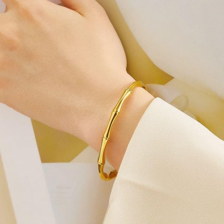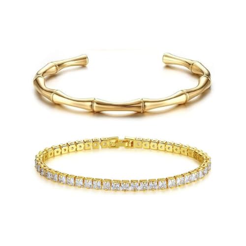Generic - Luxury Women's Bracelet Set – 2 Piece Set (Bamboo Bracelet + Tennis Bracelet with Zircon), 14K Gold Plated Stainless Steel Waterproof Stylish Design for Gifts and Occasions