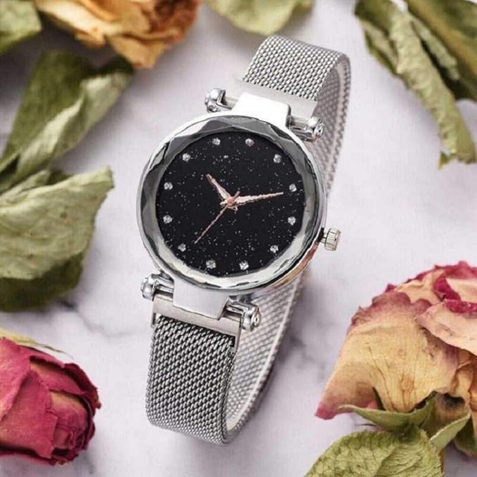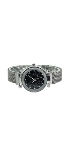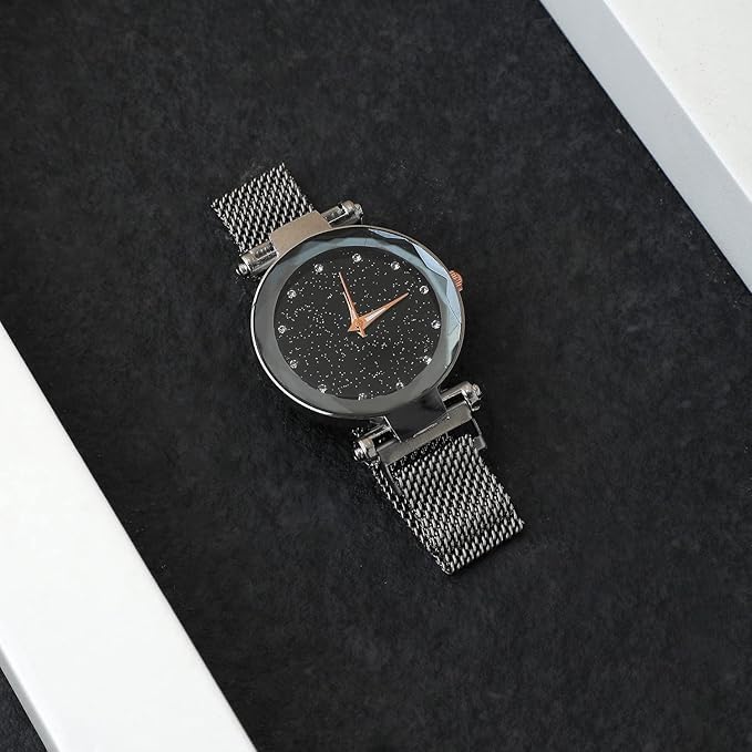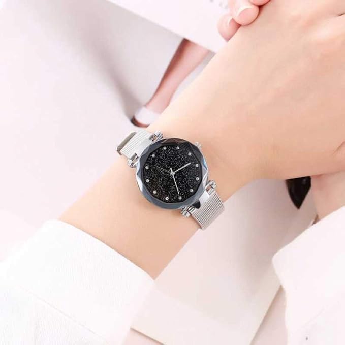 Generic - Luxury Women's Stainless Steel Wrist Watch, Shiny Black, Silver Mesh Strap, Fashion Design