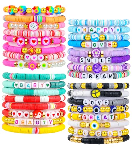 LUYI - لوي 32 قطعة من اساور مجوهرات بريبي للنساء، خرز طيني ملون، مجموعة اساور هيشي قابلة للتكديس، اساور الصداقة قابلة للتمدد، اساور بوهو Y2K للصيف والشاطئ، اساور مرنة بطبقات