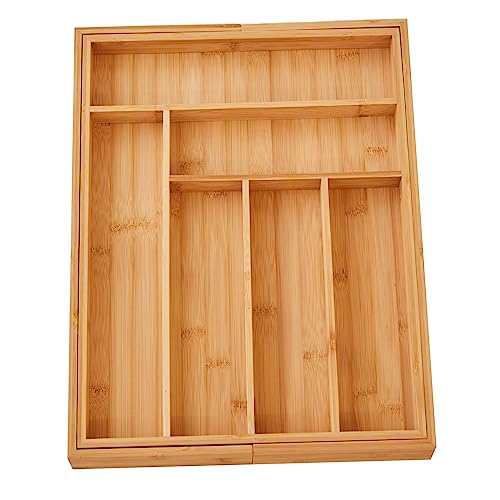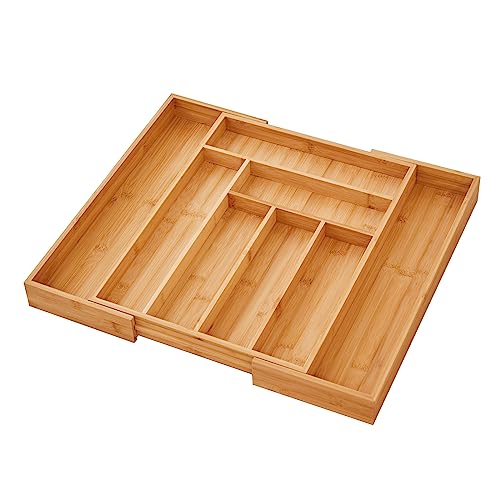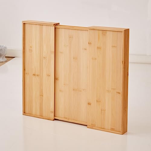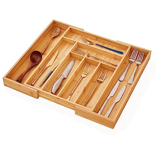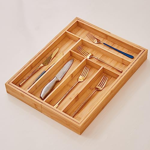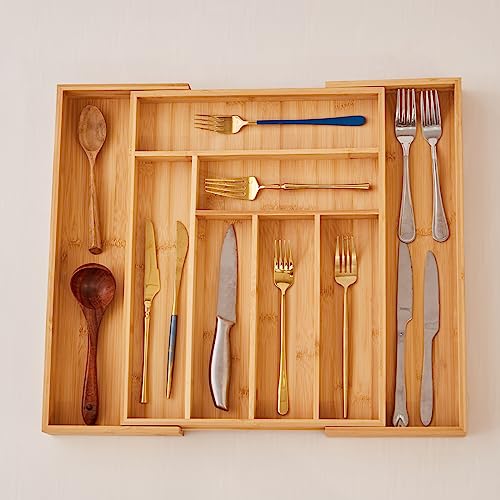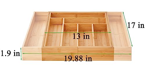 - Expandable and Adjustable Utensil Organizer: This bamboo cutlery tray organizer designed with 6-8 compartments can be adjusted from 13 inches (Closed) to 19.8 inches(Extended), with smooth sliding.