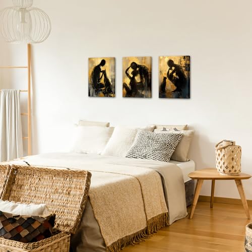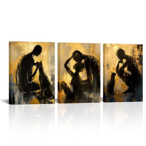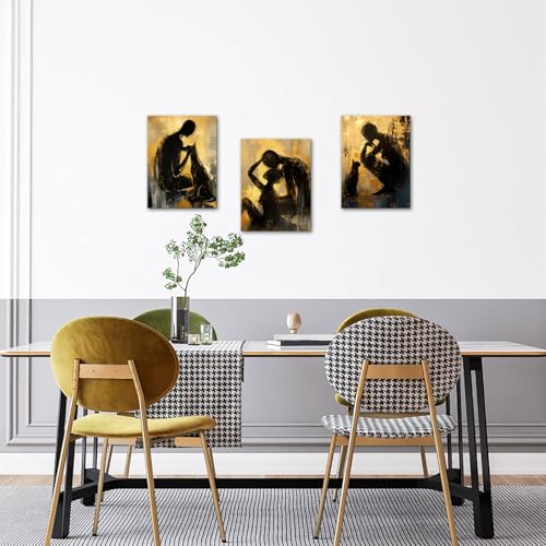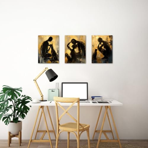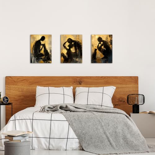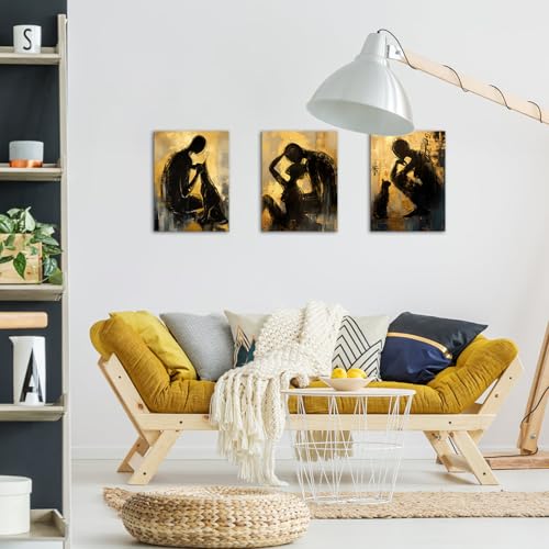 LyerArtork - لوحة فنية تجريدية للحائط من ليرارتورك مكونة 3 قطع للازواج والرجال والنساء والقطط باللونين الاسود والذهبي والاصفر اعمال حديثة لغرفة المعيشة والحمام وغرفة النوم 12×16×3 أزرق