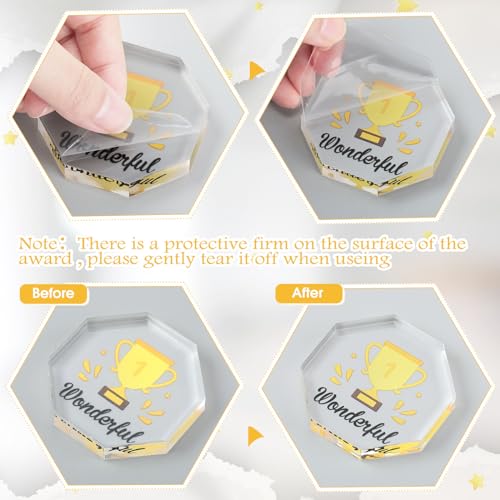 - مواد عالية الجودة: مصنوعة من مادة الأكريليك المتينة، تم تصميم هذه الجوائز للاستخدام الدائم؛ فهي قوية وموثوقة، مما يضمن الحفاظ على مظهرها الجمالي حتى مع التعامل المكثف؛ إنها بمثابة جوائز تقدير الجودة مثالية لمختلف المناسبات