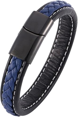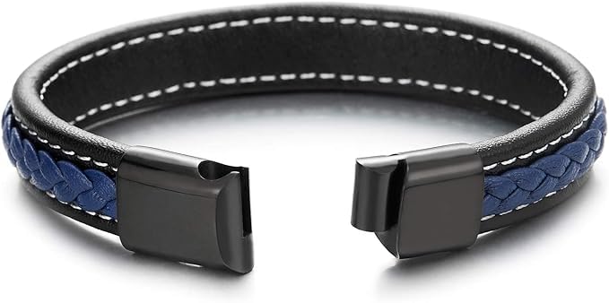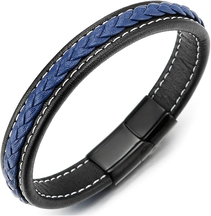 Generic - M.A.S Men Women Blue Black Braided Leather Bracelet Bangle with White Stitches Steel Black Magnetic Clasp