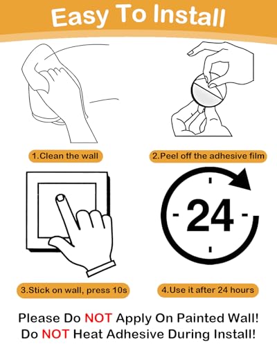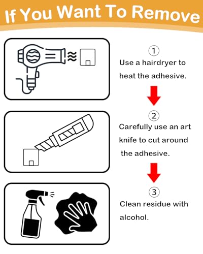 - سهل التركيب: لا حاجة للشنيور. ما عليك سوى تقشير الجزء الخلفي اللاصق الذاتي ولصق هذه الخطافات على الأسطح الملساء مثل المعدن أو الرخام أو البلاط أو الزجاج. تجنب الأسطح المطلية والخشنة. انتظر 24 ساعة قبل تعليق الأشياء لضمان تثبيت آمن.