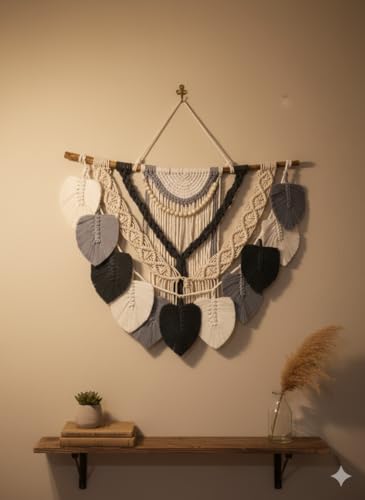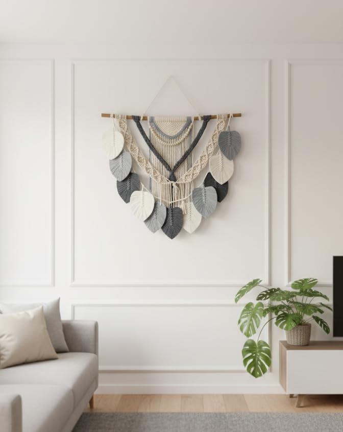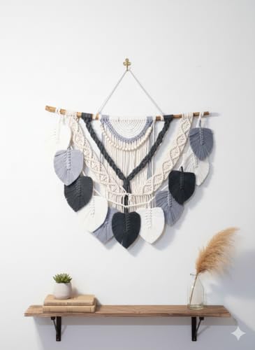 - تصميم مكرمية فني: زينة حائط محبوكة يدوياً بخيوط قطن عالية الجودة مع تفاصيل الريش والشراشيب بألوان محايدة أنيقة