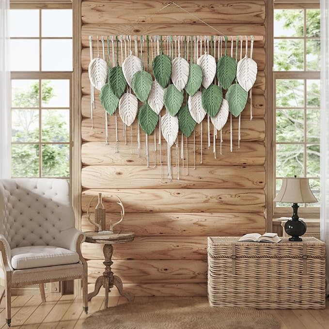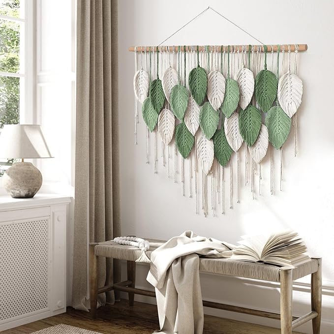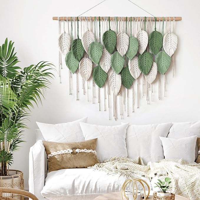 Generic - مكرمية كبيرة للتعليق على الحائط ، بساط حائط بتصميم أوراق بوهو منسوج يدويا لديكور بوهيمي المنزل وغرفة النوم المعيشة والحضانة والمكتب (99 × 75 سم)، أخضر