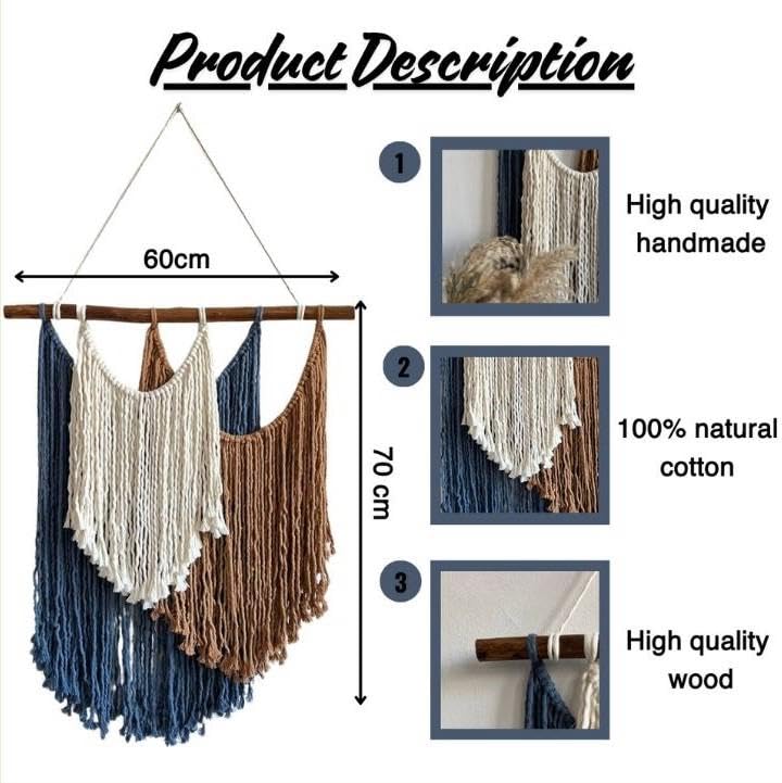 Generic - Macrame Wall Hanging, Natural Cotton, 60 x 70 cm, Navy Blue Brown White, Handmade