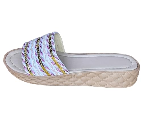 MADYOS - شبشب مسطح من ألياف صناعية بنعل متباين مفتوح من الأمام للنساء من ماديوس، أبيض/ ذهبي، 40 EU