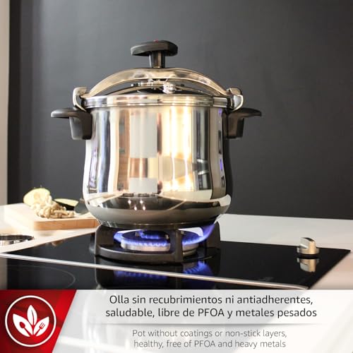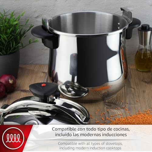 - HEAVY DUTY MATERIALS: It is made of 18/10 stainless steel very resistant to wear, encapsulated 5-layer thermo diffuser bottom for a homogeneous distribution of heat that makes it suitable for all types of cookers, including induction. The body of the pressure cooker is 22 cm in diameter and 17 cm in height. It is not recommended to fill the pressure cooker body above 3/4 parts.