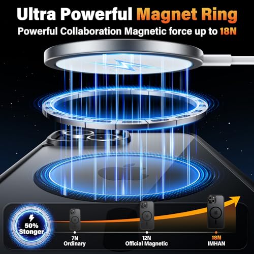 - جاذبية مغناطيسية قوية: تم تجهيز هذه الحافظة المغناطيسية من ايمهان بمغناطيس N52 فائق القوة ومحاذاة تمامًا لتتوافق تمامًا مع ملحقات ماج سيف. استمتع بالشحن اللاسلكي السريع والتثبيت الثابت لحوامل سيارتك أو غيرها من الملحقات المغناطيسية، دون انزلاق.