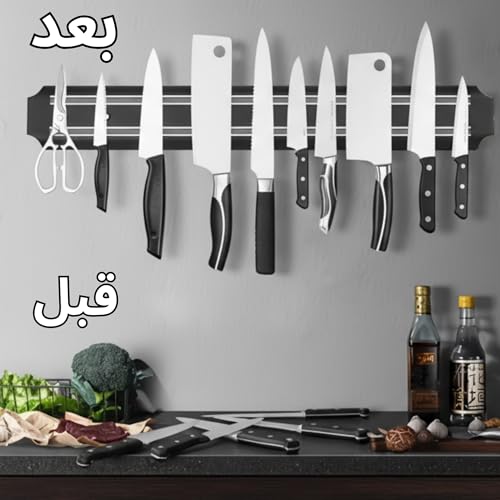- مغناطيس قوي وثبات عالي: حامل السكاكين المغناطيسي للحائط شريط مغناطيسي قوي يمسك السكاكين وأدوات المطبخ المعدنية بثبات وأمان دون سقوط.