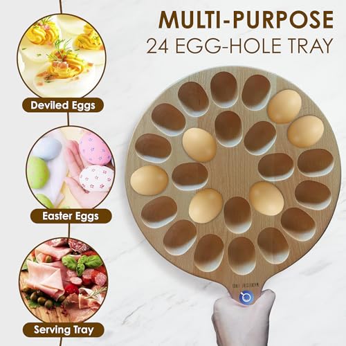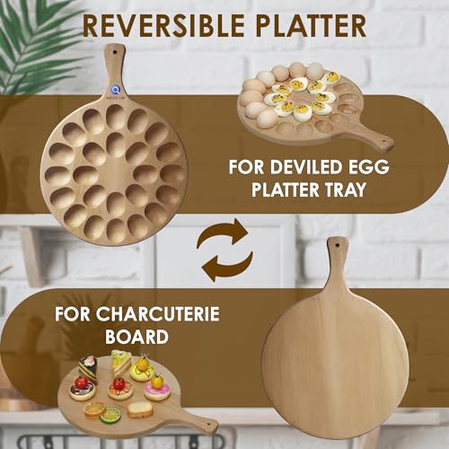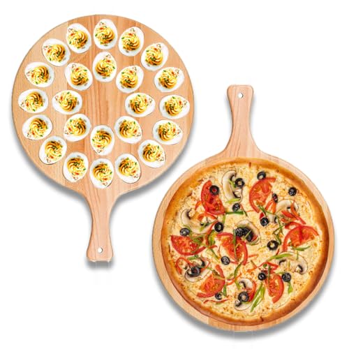 MAGNIFICENT FINDS - Reversible Wooden Deviled Egg Platter Charcuterie Board Serving Tray, Egg Trays, Countertop Pizza Peel Paddle - 24 Holes, Natural