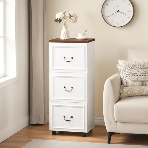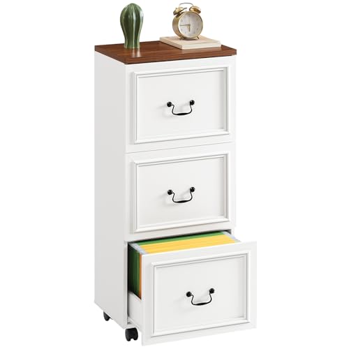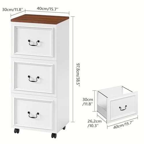 MAHANCRIS - 3 Drawer File Cabinet, Rolling File Cabinet for Home Office, Wooden Under Desk Storage, Printer Stand with Drawers, for A4/Letter-Size Files, White and Walnut FCBA3901