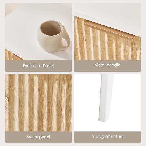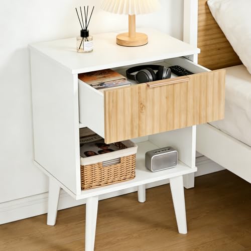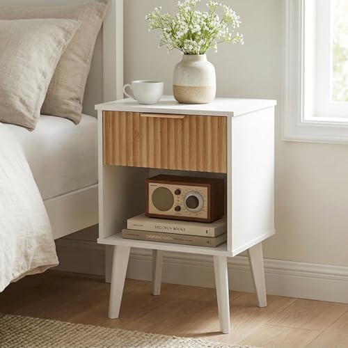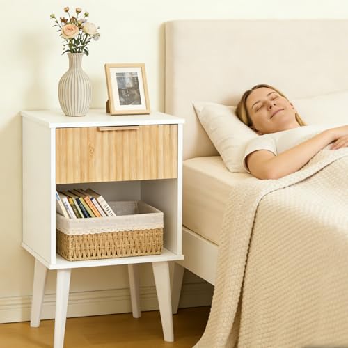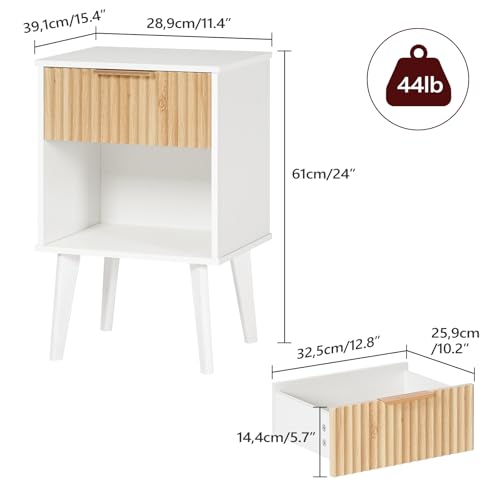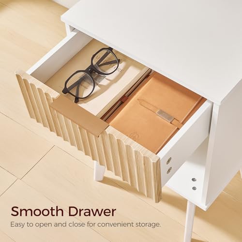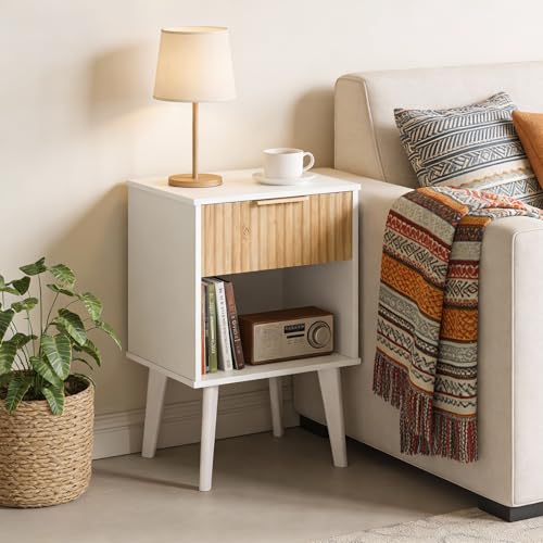 MAHANCRIS - End Table, Fluted Night Stand, Modern Side Table, Small Bedside Table with 1 Drawer and 1 Open Compartment, Mid Century Nightstand, for Living Room, Bedroom, White and Natural ETBN6201