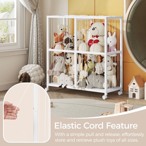 MAHANCRIS - Stuffed Animal Storage, Double-Row Zoo Stuffed Animal Net with Wheels, Movable Plush Toy Holder and Toy Storage Organizer, Space Saving for Kids Room, Playroom, Nursery, White SCBW1701