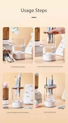 - Four steps to use, put in the right amount of water, drops of cleaning solution, insert makeup brushes into the chuck and load the host to start cleaning, dry the makeup brushes after cleaning, it can organize both makeup brushes against dust. The set includes a USB cord, making it eco-friendly and convenient. One button to control switch on/off, easy to operate.