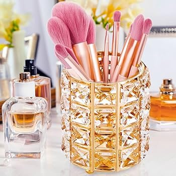• تصميم كريستالي فاخر: حامل منظم بتصميم كريستالي لامع مع إطار ذهبي أنيق يضيف لمسة جمالية راقية لطاولة المكياج أو المكتب