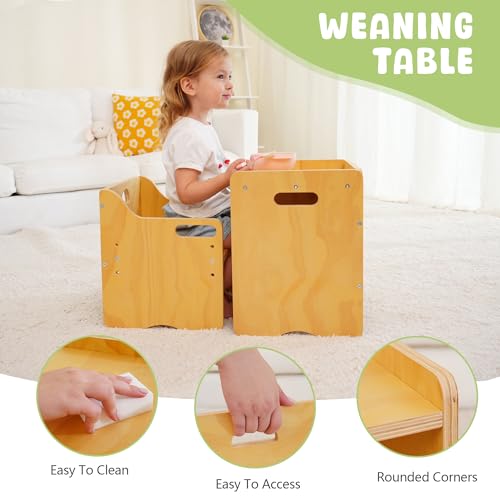- MULTIFUNCTIONAL DESIGN – Our Montessori weaning table and chair set is not just for mealtime; it also serves as a multifunctional activity center for toddlers, including painting, playing, and learning. Plus, it acts as an effective transition to a high chair