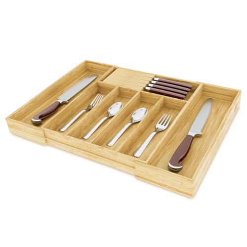 - Customized Storage Solution: Designed for ultimate convenience, this bamboo organizer perfectly categorizes your cutlery and utensils. Deep grooves and substantial capacity ensure all your kitchen tools are neatly stored.