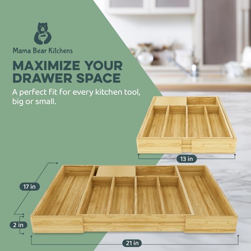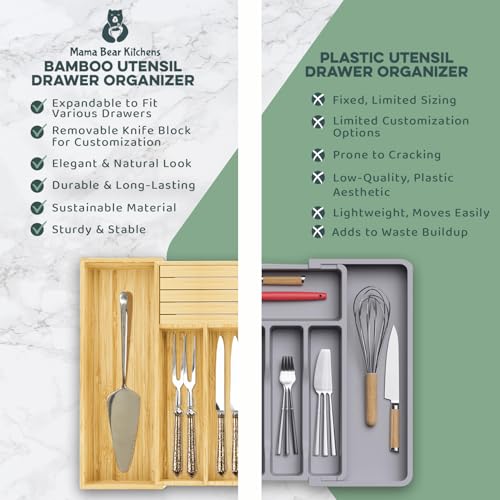 Mama Bear Kitchens - Premium Utensil Drawer Organizer | Quality Bamboo Construction | Removable Knife Block | Easily Adjustable
