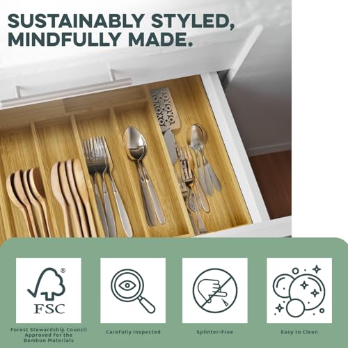 - Natural & Stylish Design: Made from FSC certified bamboo, this flatware organizer is not only sustainable but also elegantly designed. Its natural appearance and odor-resistant properties make it ideal for any kitchen.