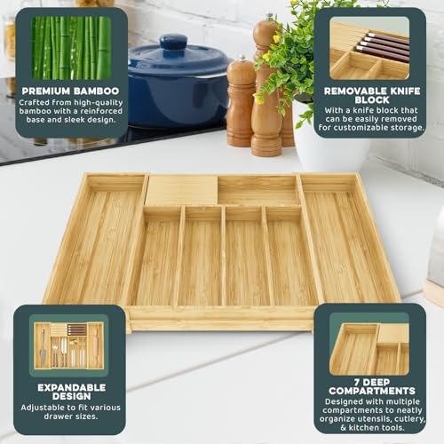 - Streamlined Utensil Organization: Our Premium Utensil Drawer Organizer offers a hassle-free solution to organize your cutlery. Slide it into your drawer for a tidy space with a removable knife block feature.