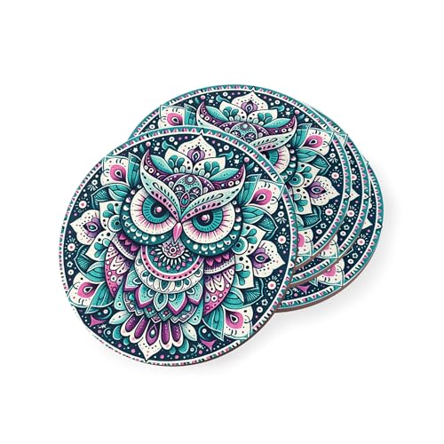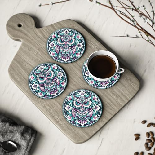 Generic - Mandala Owl Design with Intricate Boho Patterns Rubber Coasters Heat-Resistant & Durable - Set of 4 - Coaster-3