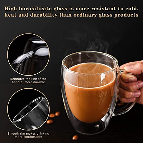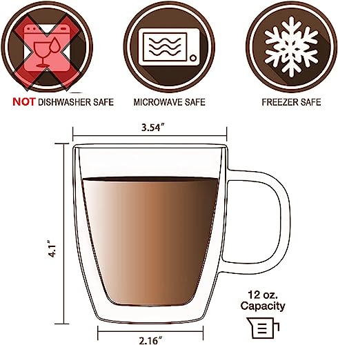 Mandorra - Double Walled Glass Coffee Mugs, Double Wall Latte Mugs, set of 2 Cappuccino Cups, Clear Espresso Cups, Insulated Glass Mugs With Handle, 12 Oz,Thermos Cup