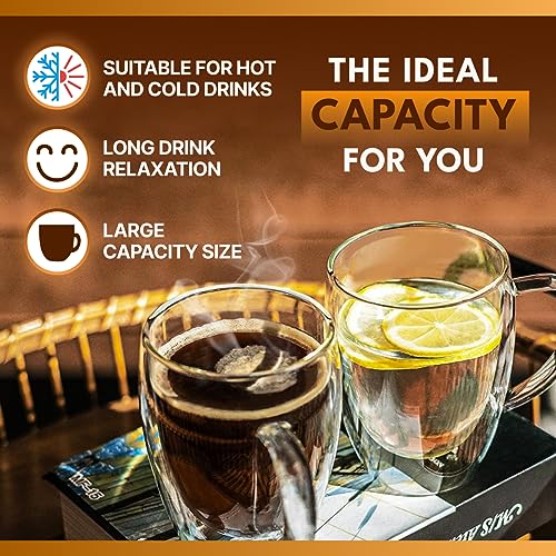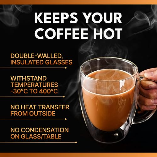 - KEEPS YOUR COFFEE HOT: Double walled, Borosilicate material, Insulated glasses can withstand temperatures ranging from -30°C to 400°C! you can enjoy your cup of coffee, espresso, cappuccino or tea warmer longer.When you have hot coffee, you won’t feel hot from outside and when you have cold drink, there is no condensation on the glass and table.